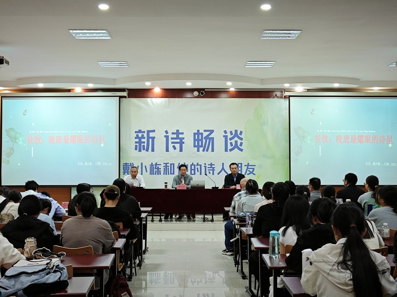 报告前我校蒋涛涛副校长代表太阳成集团tyc7111cc聘任戴小栋为太阳成集团tyc7111cc文学与新闻传播学院兼职教授。随后戴教授以《杜牧——晚唐最耀眼的诗星》为题,向在场师生作了精彩的报告。戴教授从诗人的生平讲起,分析了杜牧的人生境遇对其品格和诗歌的影响,并以其生平为主线,通过讲解杜牧人生的三处福地,带领师生赏析杜牧不同时期的诗歌作品,归纳出杜牧诗歌的艺术特点。报告基于确凿的史料分析,既有感兴的诗性体验,更有理性的学术表达,有宏观视野的探究,也有微观文本的关注,全面而立体化地展示了晚唐杰出诗人杜牧的文学价值。