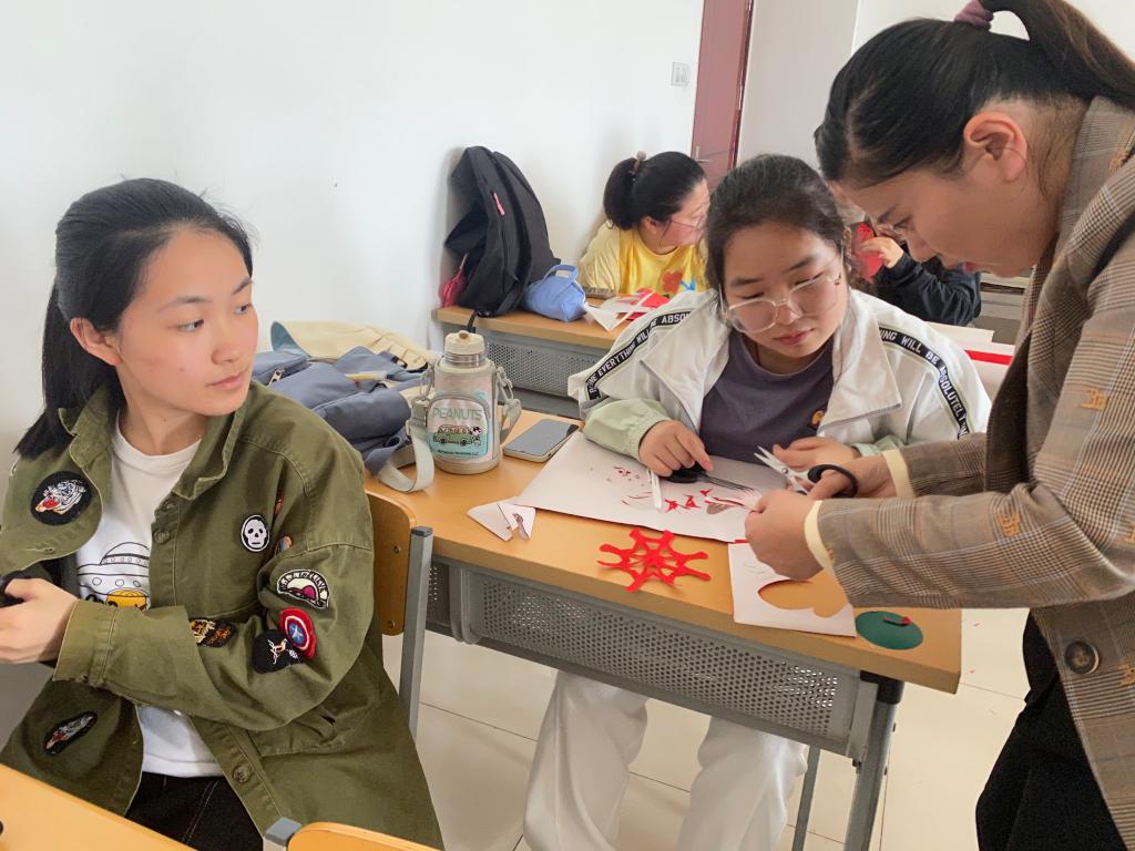 活动中,石万照老师向学生们展示了蝴蝶剪纸画作,介绍了剪纸的起源、制作工具与材料。她结合自身的剪纸经验,从剪制要领、剪制技巧等方面做了详细讲解,并通过作品评析和现场演示,为同学们讲授了剪纸艺术的技能技法,使大家全方位地了解中华传统文化剪纸艺术。活动现场,同学们聚精会神,认真学习了相关知识,并通过石万照老师的手把手式教学,陆续完成了自己的剪纸作品。
