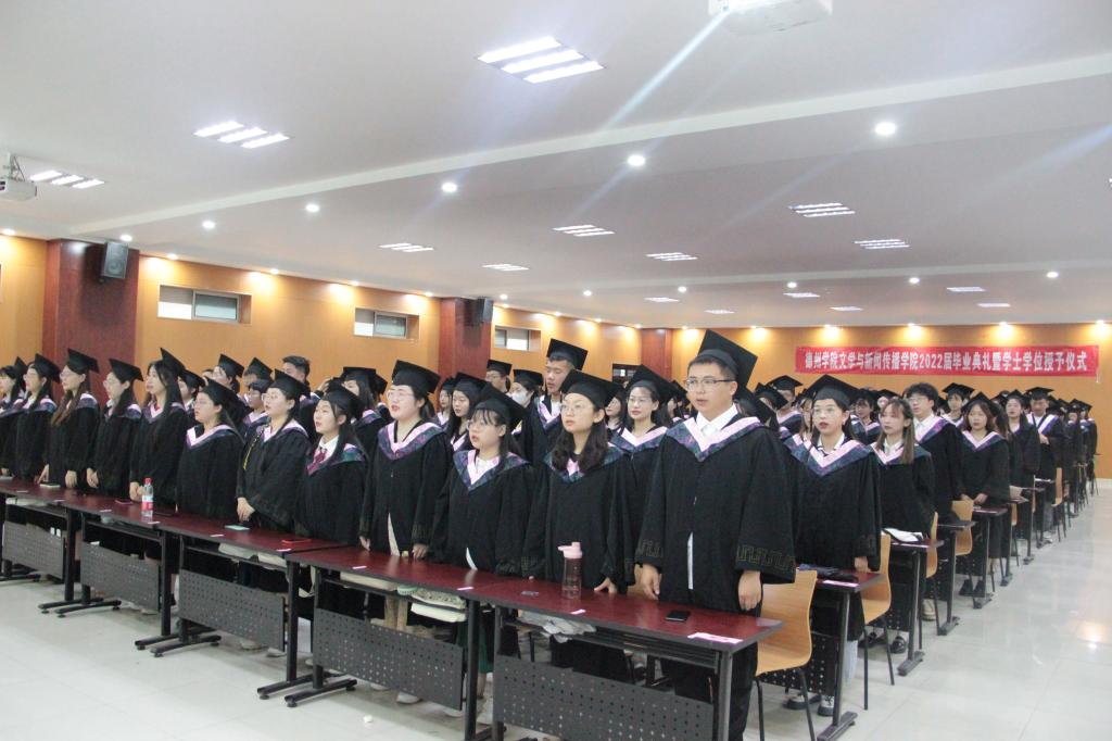 在庄严的国歌声中,毕业典礼正式拉开帷幕。文学与新闻传播学院学术委员会主席、委员为2022届本科毕业生援正流苏,授予学士学位证书并合影留念。教师代表的发言充满了依依别情,又带着殷殷期盼,希望广大2022届毕业生能够秉承“崇德启智,励志博学”的校训,乘风破浪,勇往前行,带着老师的嘱托和母校的期望奔赴祖国各地开始崭新征程。2022届毕业生代表向老师们表达了衷心感谢,感恩母校的培养,在四年的德院生活中,不仅学到了知识,更学会了怎样做人做事。