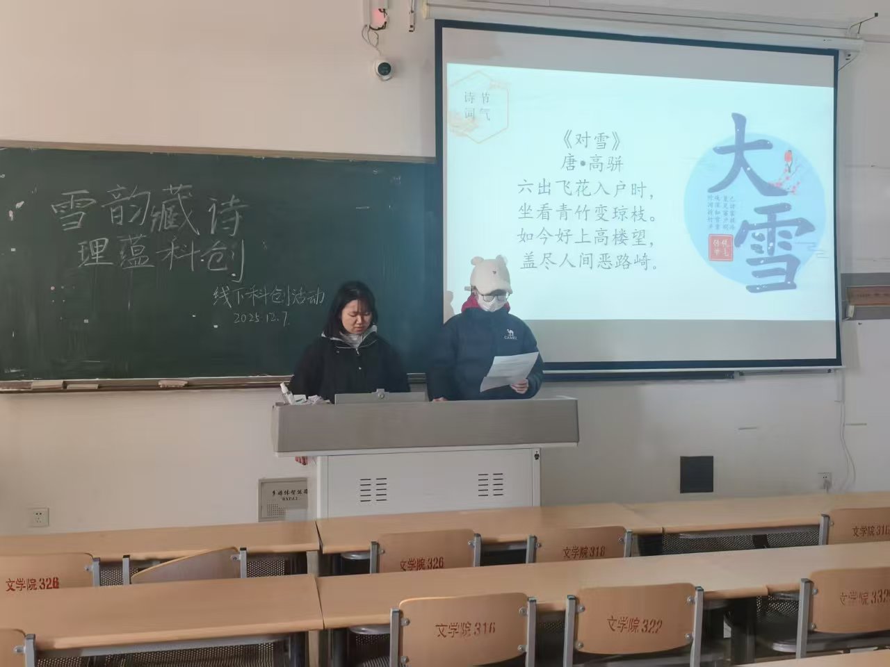 为推动传统文化与科技创新深度融合,丰富学生校园文化生活,激发文理交叉创新思维,12月7日,太阳成集团tyc7111cc在博文楼317教室举办“雪韵藏诗,理蕴科创”线下科创活动,活动以大雪节气为独特契机,以古典诗词为文化纽带,创新性地搭建起文理学科跨界交流的平台。