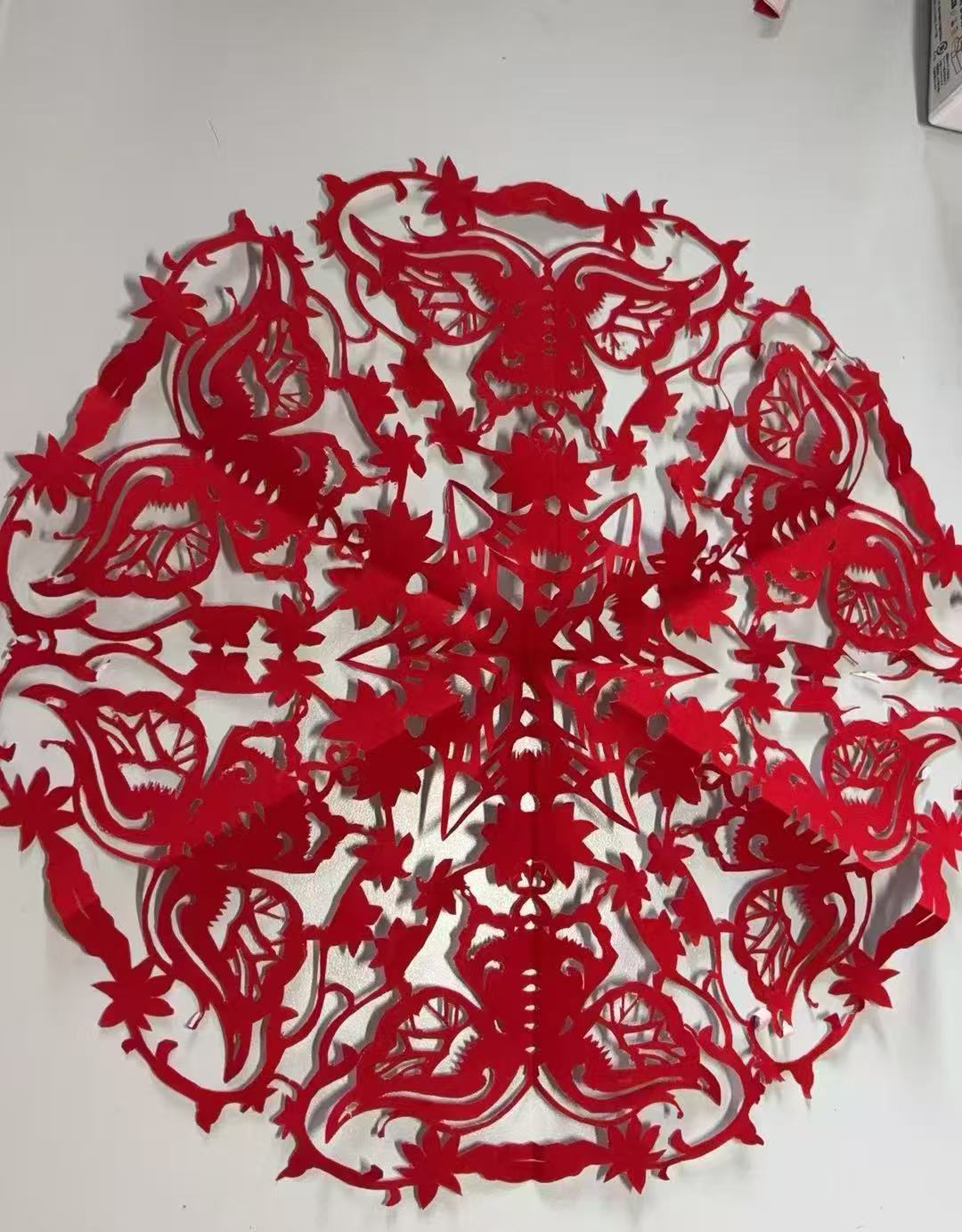 活动期间,大家分工明确、默契十足,同步推进创作。负责图案设计的同学,翻找传统纹样资料,结合宿舍特色勾勒草图;专注裁剪的同学,指尖翻飞间,红纸在剪刀下逐渐成型,喜鹊登梅、年年有余等经典图案线条流畅,尽显传统韵味;同学们发挥文史专业优势,将诗词意象、历史典故融入设计,让窗花兼具美感与文化底蕴。创作间隙,大家会互相展示进度、交流技巧,遇到复杂纹样就一起讨论解决方案,始终保持着紧密的创意联结,每一幅作品都凝聚着宿舍成员的共同思考与心血。