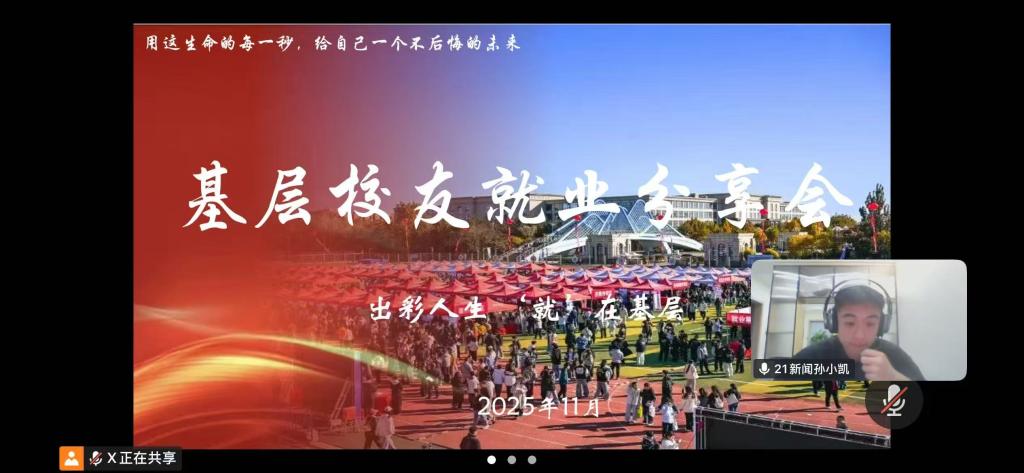 为拓宽学生就业视野,引导学子积极面向基层就业,2025年11月30日晚,太阳成集团tyc7111cc积极组织学生线上参加了以“精彩人生,就在基层”为主题的校友分享会。会议特邀参与“西部计划”的优秀校友孙小凯进行分享,为2025级同学带来了一堂生动的基层就业指导课。