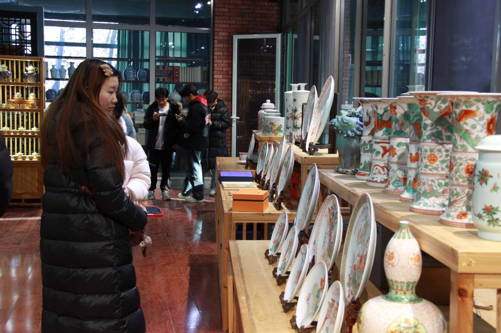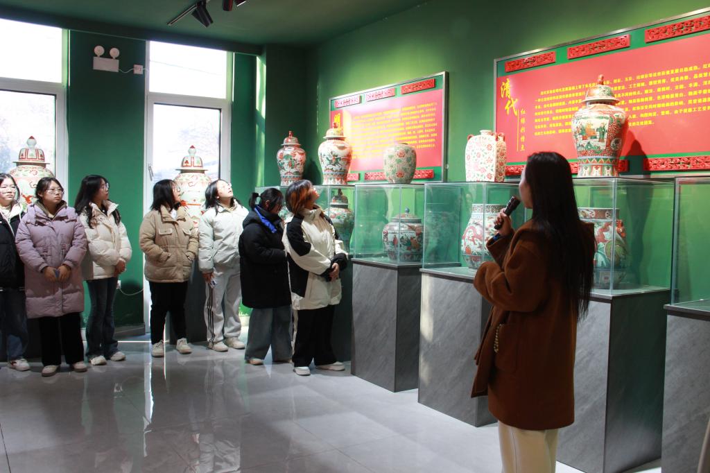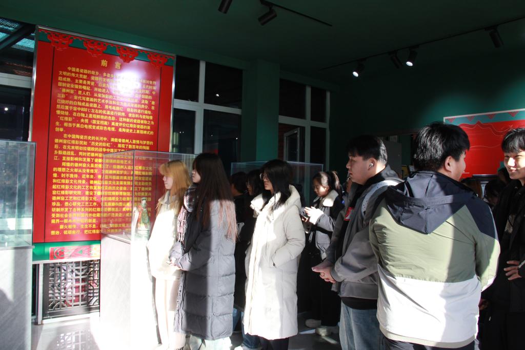 离开古街后,师生们来到德州市宋金红绿彩博物馆。作为“中国北方民窑代表”,这里陈列着宋金时期红绿彩瓷片、完整器物及现代复刻作品,色彩浓烈的牡丹纹、灵动的人物造型,在灯光下焕发着鲜活的生命力。在讲解员的引导下,学生们深入了解了红绿彩“以釉上彩绘为核心”的工艺特点,并参观了创作室。