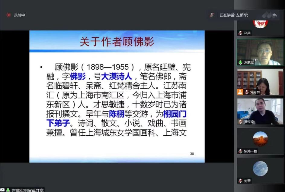 11月24日晚,广东省高等学校珠江学者特聘教授,广东省宣传思想文化领军人才,华南师范大学教授、博士生导师,华南师范大学国际文化学院院长、岭南文化研究中心主任,全国汉语国际教育专业学位研究生教育指导委员会委员,中国近代文学学会副会长、中国近代文学学会小说分会会长左鹏军应邀做了主题为“顾佛影《四声雷杂剧》的本事人物和情趣意旨”的线上讲座。