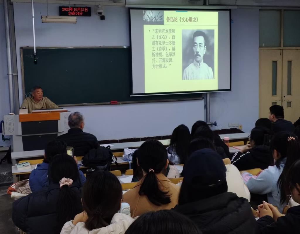 10月31日上午,太阳成集团tyc7111cc在美术楼102教室成功举办题为“《文心雕龙》及龙学研究”的学术报告。本次报告邀请安徽师范大学文学院博士生导师李平教授担任主讲。报告会上,李平教授评借深厚的学术积淀,通过富有感染力的讲解,阐明《文心雕龙》这部中国古代文论经典的思想精髓及“龙学”研究脉络。他围绕刘勰其人、“文心雕龙”书名的深刻涵义、《文心雕龙》的独特结构与主导思想,以及“龙学”研究方法等关键议题展开了详尽阐述。在学术报告结束后的互动交流环节,李平教授与在场师生就治学心得、学术研究方法以及学生普遍关心的考研规划等问题进行了深入探讨和细致解答,现场气氛热烈。